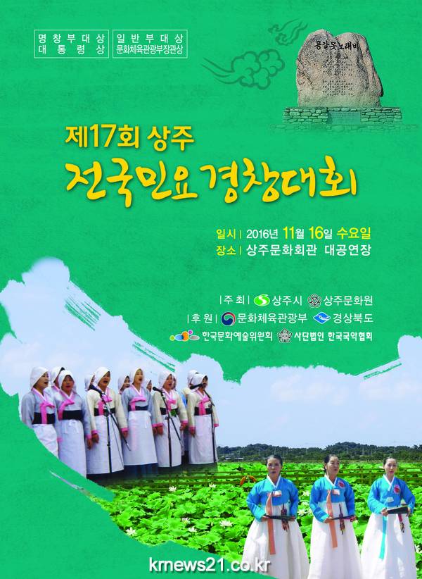 제17회 상주전국민요경창대회를 경북 상주문화회관에서 2016년 11월 16일(수) 09시부터 개최 할 예정이다. 20세 이상 남.여 및 학생(초.중.고)이 참가 가능하며 명창부, 일반부, 신인부, 학생부로 진행된다.