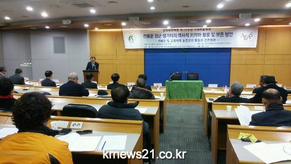 성균관대학교 600주년 기념관(서울시 종로소재)에서 지난 10일 열린‘동학농민혁명 학술대회’는‘전봉준 장군 생가터의 역사적 의의와 활용 및 보존 방안’을 주제로 김상호 고창군 부군수, 동학농민혁명기념재단 관계자, 전국동학농민혁명유족회 정남기 고문, 고창동학농민혁명기념사업회 진윤식 부이사장 등 120여명이 참석한 가운데 열렸다.