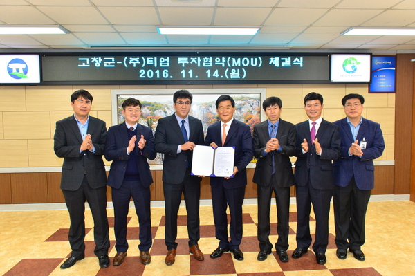 고창군(군수 박우정)이 ㈜티업(대표이사 김범수), (농)청파원(대표이사 김종제)과 투자협약을 체결했다.