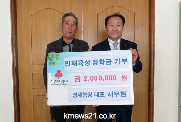 정읍시 태인면 소재 장재농장 서우현 대표가 23일 지역 내 태인고등학교에 재학 중인 학생들의 인재 육성에 써달라며 장학금 200만원의 기부했다