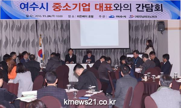 여수시(시장 주철현)는 24일 히든베이호텔에서 (재)전남테크노파크 등 중소기업 유관기관 관계자, 지역 중소기업 대표 80여명이 참석한 가운데 현장소통 간담회를 가졌다.