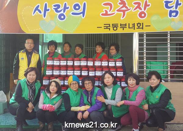 국동 새마을부녀회원과 주민센터 직원 등 15명은 3kg 고추장 80개를 만들어 경로당 18개소와 생활형편이 어려운 독거노인과 중증장애인 등 소외계층 62세대에 전달해 주었다.