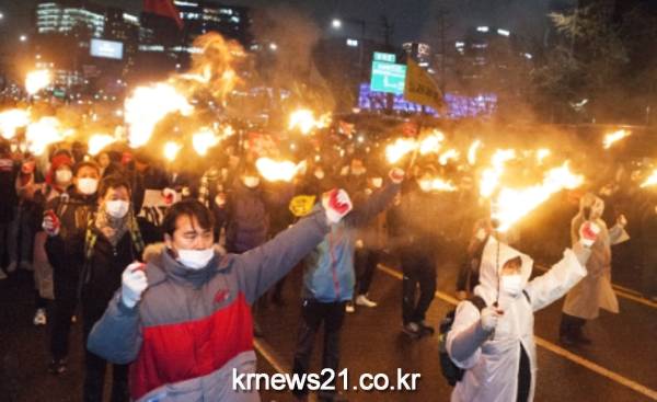 이날 집회의 절정인 `횃불`이 밝혔다. 오후 7시 30분께 광화문 앞에 횃불을 든 참가자들이 등장했고, 이어 내자동과 삼청동 쪽으로 행진했다.