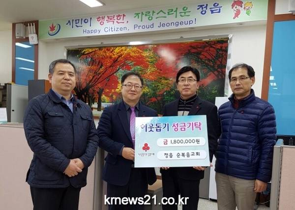 정읍순복음교회(담임목사 장정환)가 저소득 소외계층을 위해 써달라며 내장상동주민센터에 180만원을 기탁했다.