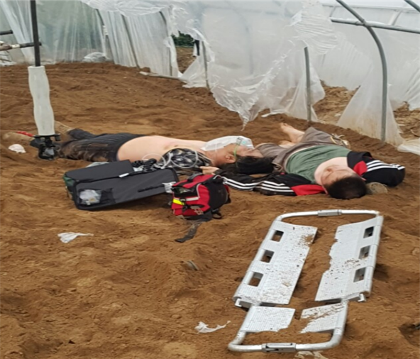 ▲ 비닐하우스에서 관리기 작업 중 질식환자현장도착한 구급대는 비닐하우스를 뜯어 환기를 시키자, 얼마 후 큰 아들은 의식이 회복됐고 가족 3명을 산소공급 및 CPR을 병행하여 전북대병원으로 이송 중 의식이 회복되어 생명을 살렸다.