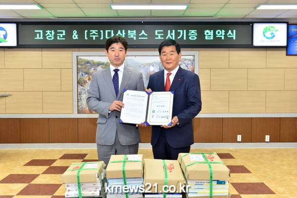 고창군(군수 박우정)과 ㈜다산북스는 6일 고창군청 회의실에서 지역 내 문화소외계층과 아동시설 등에 다산북스의‘후(who)?’시리즈를 비롯한 단행본 2만부(2억원 상당)를 기증하는 내용의 협약을 체결했다.