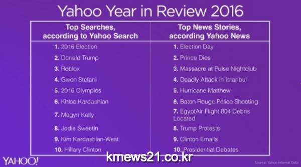 2016년 미대선과 대통령 당선자 도널드 트럼프가 올해 최다 검색어 목록 선두에 있다는 것은 전혀 놀랍지 않다. 10위 중 6개 순위를 그웬 스테파니(Gwen Stefani), 조디 스위틴(Jodie Sweetin), 메긴 켈리(Megyn Kelly), 민주당 대통령 후보였던 힐러리 클린턴 같은 여성이 차지하면서 여성들 또한 이 목록을 점령했다. 킴 카다시안-웨스트가 ‘인터넷을 부숴버리자’(Breaking the Internet) 부문에서 올 한해 잠시 빠지면서 클로에가 난생 처음으로 언니를 제치고 야후에서 가장 인기 있는 카다시안으로 선정됐다. 시장 출시 이후 거의 10년 동안 가장 인기를 끌었던 롤플레이 게임인 로블록스(Roblox) 또한 올해 최다 검색어 목록에 등장했다.