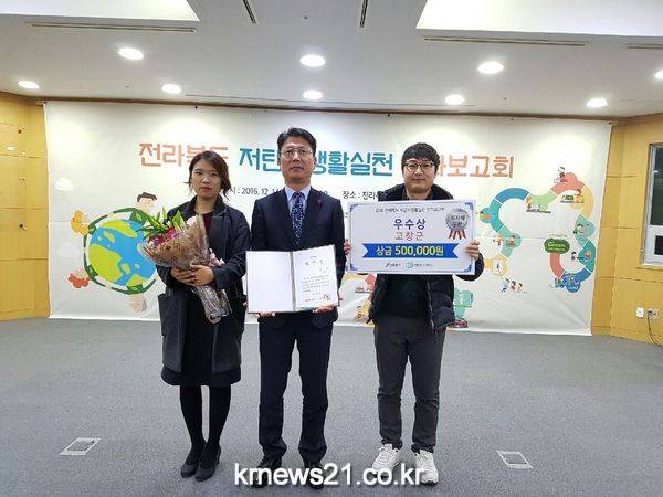 ▲ 사진 가운데 고창군 환경위생과 수질보전팀 강필구 팀장 고창군(군수 박우정)이 군민과 함께 에너지절약을 위해 노력해 전북도가 실시한 ‘2016년 시·군 녹색생활 실천운동 평가’에서 우수 기관으로 선정됐다.