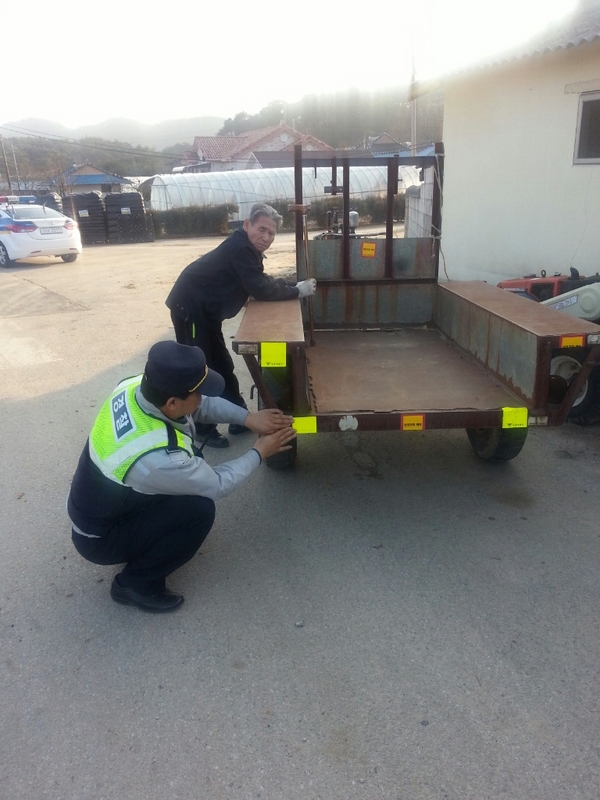 농사철이 아님에도 불구하고 포근한 날씨로 인해 경운기 운행이 증가하고, 운전자의 고령화로 민첩성이 떨어져 운전미숙으로 인한 사고가 발생하고 있으며, 특히 야간에는 후방에서 접근하는 차량이 앞서가는 경운기 등 농기계를 미처 발견하지 못하여 추돌하는 사고가 발생하는 등 인명사고로 이어지고 있어 이를 예방하기 위하여 관내 순찰활동 중에 경운기 등 농기계 대상으로 야간에 시인성이 높은 야광반사지를 부착하고, 마을회관을 순회 방문 안전교육을 실시하고 있다.