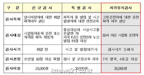 자격유지검사는 일정 주기(65세∼69세: 3년, 70세∼: 1년)마다 주의력 등을 알아보는 운전적성검사를 통해 자격유지 가능 여부를 판정한다.