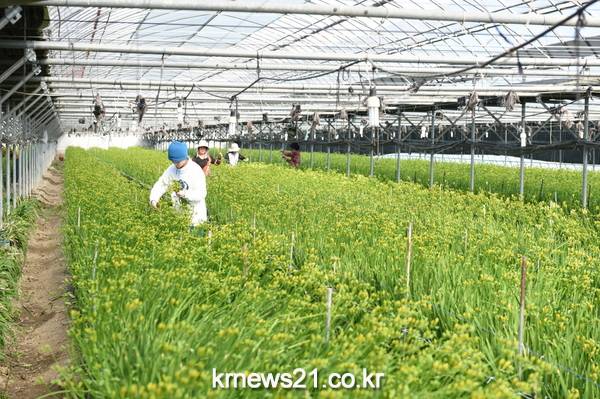 규모의 연동하우스에서 15만 본의 프리지아를 출하 중이며 겨울철 대체작목으로서 선택에 크게 만족하는 이채민 농가는 “앞으로