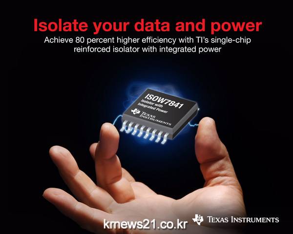 TI가 기존의 통합 디바이스보다 80% 더 높은 효율의 전력을 제공하는 단일 칩 강화 아이솔레이터를 출시한다고 밝혔다. 신제품 ISOW7841 강화 아이솔레이터는 업계 최고 효율의 전력 공급, 최저 전자파 방사, 최고 내성을 제공함으로써 공장 자동화, 그리드 인프라, 모터 제어, 절연 전력, 테스트 및 계측 장비와 같은 산업용 시스템의 신뢰성 높은 동작을 지원한다.