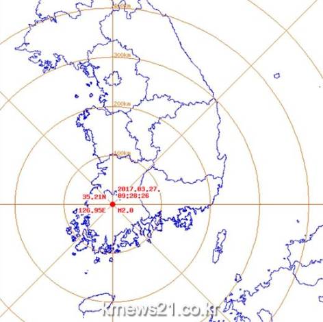 진앙은 북위 35.21도, 동경 126.95도 지점이다. 기상청에 따르면 규모 2.0 지진은 고층 건물에서 극소수의 사람만 느낄 수 있는 정도다.