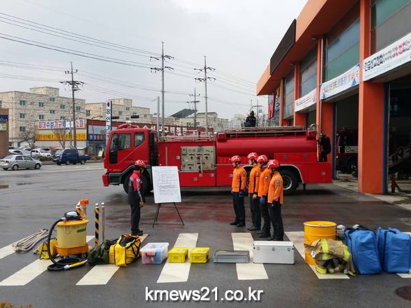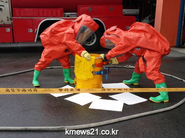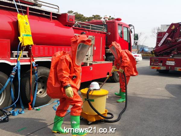 주요 훈련내용은 유해화학물질 사고 대응절차(재난현장 표준작전절차 SOP310)에 따라 ▲ 사고 상황 신속 파악 및 출동대 화학보호복 등 개인안전장비 착용 ▲ 현장상황에 따른 안전통제선 설정 ▲ 화학물질 누출차단 조치 ▲ 유관기관 회수차량에 의한 유독물 회수 ▲ 오염장비 철저한 제독 및 검사 등으로 진행됐다.