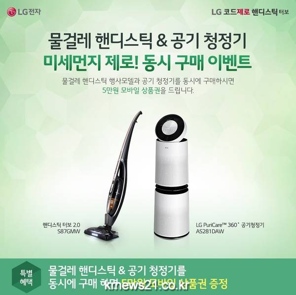 미세먼지가 기승을 부리는 봄을 맞아 LG전자가 ‘미세먼지 제로! 동시 구매 이벤트’를 진행한다. LG전자는 물걸레 핸디스틱과 퓨리케어 공기청정기를 함께 구매하는 고객에게 5만원 상당 모바일 상품권을 증정한다.
