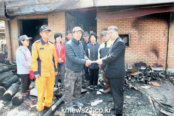 전주덕진소방서는 4월 13일 오전, 4월 11일 새벽 5시경 완주군 비봉면에서 발생한 주택화재로 어려움을 겪고 있는 주민 김OO(남,52세 / 완주 비봉 남성의용소방대 소속)를 찾아가 화재피해 복구 지원과 위로금을 전달했다.
