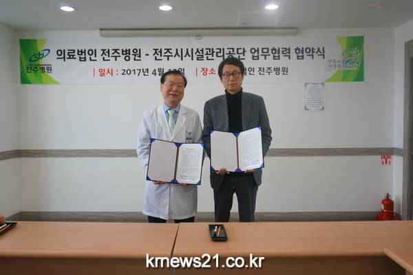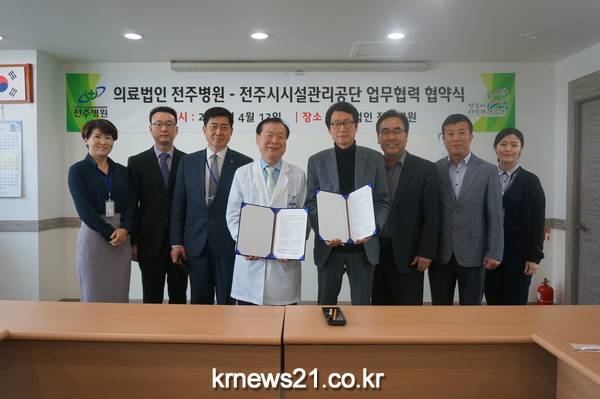 의료법인 전주병원은 4월 13일 오전 의료법인 전주병원 인공신장센터 3층 교육실에서 전주시 시설관리공단과 업무협력 협약식을 체결했다.