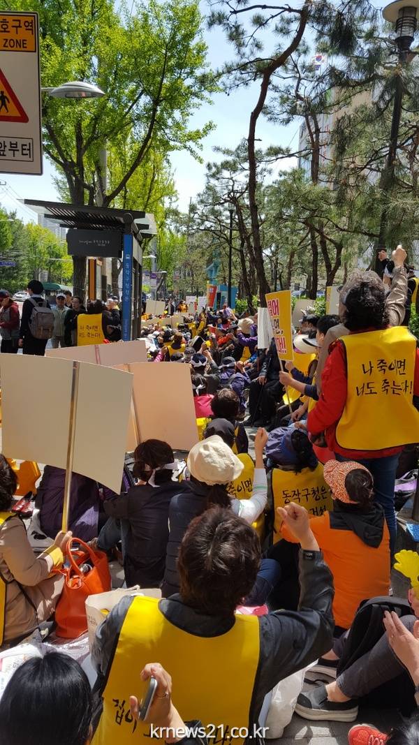 5시간여동안 동작구청 앞에서 300여명의 조합원이 모여 "노량진본동지역주택조합은 대우건설의 기획에