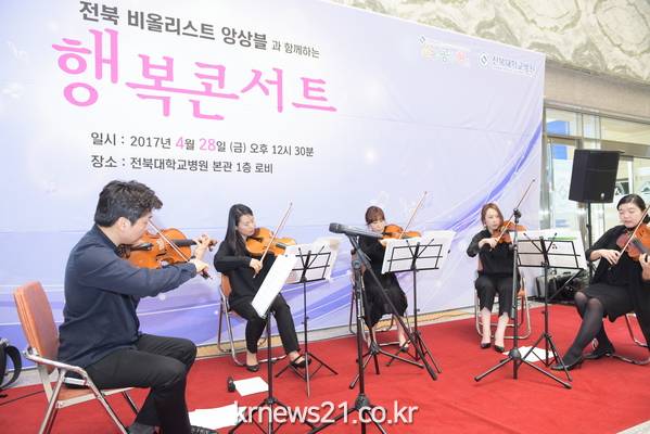 전북대학교병원은 가정의 달을 앞두고 28일 본관로비에서 환우를 위한 작은음악회로 ‘전북비올리스트앙상블과 함께하는 행복콘서트’를 개최했다.병원에서 치료를 받고 있는 환우들의 투병 의지를 북돋아주고 희망과 치유를 위해 마련한 이날 콘서트는 환우와 가족, 내방객, 직원 70여명이 참석한 가운데 진행됐다. 공연을 펼친 전북비올리스트앙상블은 전주시향 비올라 수석으로 활동하고 있는 비올리스트 김병완이 이끄는 비올라 앙상블을 위한 전문 연주단체로 1995년 창단해 현재까지 수준 높은 음악과 다양한 레퍼토리로 매년 정기연주회를 갖는 등 꾸준히 활동을 펼치고 있다.