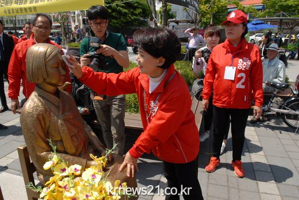 이순삼 여사는 “남편에게 표를 몰아주면, 처갓집 기둥에 대고 큰 절을 할 것”이라며, “전북의 사위 홍준표에게 전북의 꿈과 미래를 맡겨 달라”고 부탁했습니다. 남부시장 상인분들 인사을 나누었다.또한 풍남문광장 홀로 앉자있는평화의 소녀상 얼굴 과 다리를 손수가졌온 손수건으로 딱아주었다.