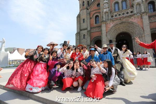 한옥마을 전동성당 전북시민 한분하분에게 환한미소를 지으며  인사와 기념사진을찍어주었습니다.