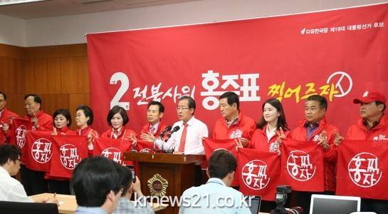 홍준표 자유한국당 대통령후보는 1일 “최근 영남과 수도권 등에서 지지율이 상승하고 있다”며 “전북에서 20%의 지지를 보내주면 당선돼 일을 잘 할 수 있다”고 말했다.홍준표 후보는 이날 오후 전북도의회 브리핑룸에서 기자회견을 갖고 “처음에는 나를 투명인간이나 군소정당 후보로 취급하더니 (최근 지지율이 오르면서)이제는 언론에서도 그렇게 못하고 있다”고 주장했다. “그동안 전북에서는 민주당에 표를 몰아줬지만 덩달아 따라가는 역할만 하지 않았느냐”면서 “전북에 약속한 공약이 확실히 추진될 수 있도록 20% 이상의 지지를 보내달라”고 호소했다.