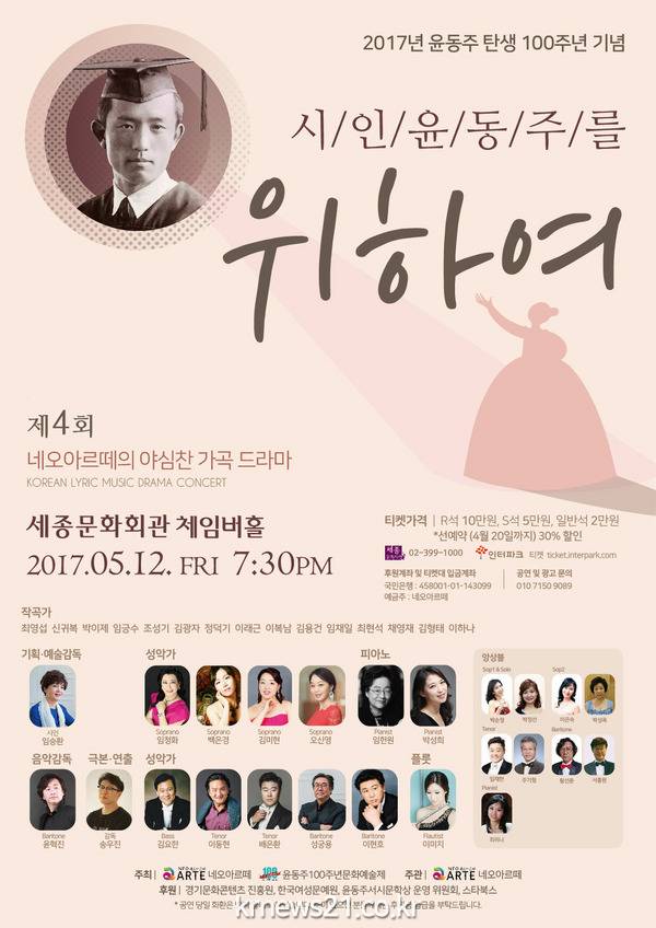 한국인이 사랑하는 시인 윤동주의 탄생 100주년을 맞아 의미 있는 공연이 찾아온다. 12일 완연한 봄을 더욱 만개시킬 공연 ‘시인 윤동주를 위하여’가 세종문화회관 체임버홀에서 펼쳐진다.