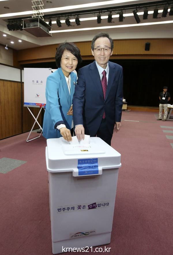 19대 대선 사전투표가 시작된 4일 전북도청에 마련된 효자4동사전투표소에서 송하진도지사가 부인 오경진여사와 사전투표를 하고 있다.