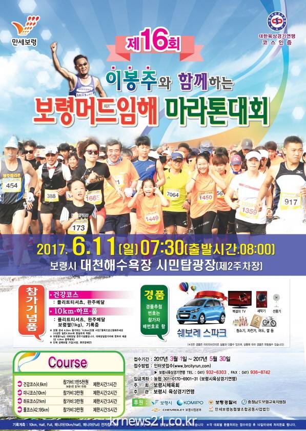보령시는 오는 6월 11일 오전 7시 30분부터 대천해수욕장 일원에서 ‘제16회 이봉주와 함께하는 보령머드임해 마라톤대회’를