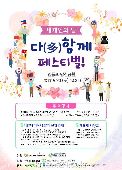 영등포구(구청장 조길형)는 5월 가정의 달과 세계인의 날을 맞이하여 오는 20일 당산공원에서「다(多)함께 페스티벌」을 개최, 내국인과 외국인이 함께 서로의 문화를 이해하고 나누는 즐거운 축제의 장을 연다고 밝혔다.