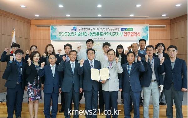 신안군은 지난 5월 16일 농협중앙회목포신안시군지부와 상호 유기적인 업무협력 체계를 구축하기 위해 지부사무실에서 팀장급이상 20여명이 참석하여 업무협약(MOU)을 체결했다.