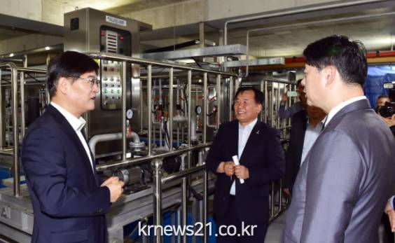 ▲ 이한규 수원시 제1부시장(오른쪽), 김우식 수질관리팀장(가운데)이 조경규 환경부 장관(왼쪽)에게 시설 현황에 대해 설명하고 있다./제공 = 수원시조경규 환경부 장관은 26일 수원시 송죽동 만석공원 일원에 위치한 ‘일왕저수지 비점오염 저감시설’을 방문해 운영현황을 점검했다.