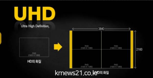 UHD 채널은 텔레비전에서 채널 검색 후 KBS1 UHD TV 9-1번, KBS2 UHD TV 7-1번, SBS UHD TV 6-1번, MBC UHD TV 11-1번에서 시청할 수 있으며, 화면 오른쪽 상단 방송사명 우측에 ‘UHD’ 표기(예: KBS UHD, MBC UHD, SBS UHD)로 확인할 수 있다.