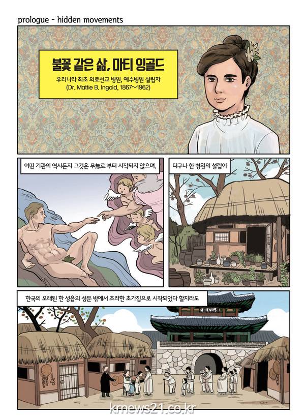 예수병원 설립자 마티 잉골드의 이야기가 6월 20일 ‘불꽃같은 삶’이라는 제목의 만화로 제작되어 출판되었다. 마티 잉골드는 1892년에 미국 남장로교 선교사로 임명을 받은 후 1897년 우리나라 전주성 서문 밖에 도착해 1898년 11월 3일 여성과 어린이의 진료를 시작했다. 119년 전 동학혁명 직후 마티 잉골드에 의해 설립된 예수병원은 한강 이남에 세워진 최초의 근대적 병원이다. 뿐만 아니라 호남 벌에 근대화의 시작을 알린 우리나라 최초 민간의료선교 병원으로 실로 호남을 비추는 등대였고 생명을 살리는 빛이었다.
