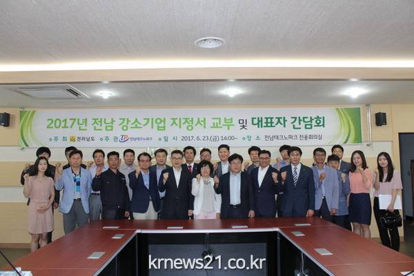 임채영 전라남도 경제과학국장은 지난 23일 전남 강소기업으로 지정된 20개 기업 대표에게 지정서를 교부하고 애로 및 건의사항을 청취했다. 이 자리에서 임 국장은 “전남 강소기업 육성사업이 새 정부 일자리 정책의 핵심인 ‘스타트업→강소기업→중견기업’으로 성장하는 프로그램과 부합된다”며 “기업과 지방정부, 기업 지원기관이 협력해 전남 강소기업이 일자리 창출의 모범 모델이 되도록 성장시켜나가자”고 강조했다.