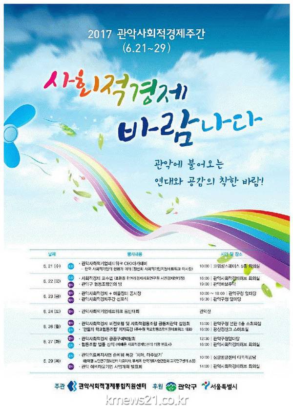서울 관악구(구청장 유종필)는 21~29일까지 ‘2017 관악사회적경제주간’으로 선포, 사회적경제 조직과 주민이 참여하는 ‘사회적경제 바람나다’ 를 개최한다고 26일 밝혔다.