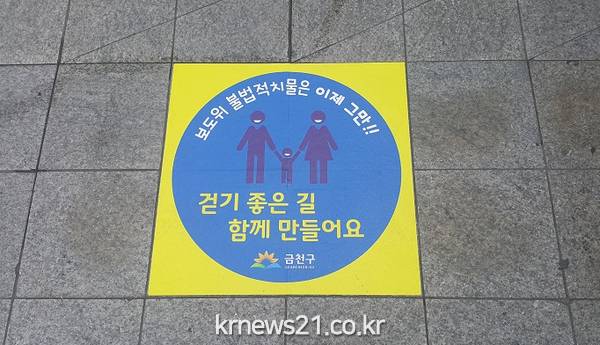 지난 달 29일 금하로(금천구 시흥사거리↔은행나무사거리) 보도에 시범으로 ‘걷기 좋은 길 함께 만들어요’문구가 적힌 보행자 통로 안내 픽토그램을 시범 설치했다.