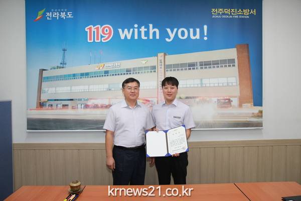 전주덕진소방서(서장 강원석)는 “소방사 홍진기 대원 같은 직원들의 노력이 안전한 전주덕진, 신뢰받는 소방조직으로 나아갈 수 있다며 앞으로도 도민들의 소중한 생명을 구하기 위해 전주덕진소방서가 최선을 다하겠다고 전했다.