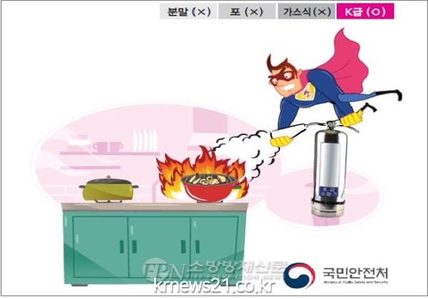 화재는 연소특성에 따라 A급 화재, B급 화재, C급 화재, D급 화재로 분류된다. A급 화재는 일반가연물 화재를 말하며, B급 화재는 휘발유 등 유류화재를 말한다. C급 화재는 전기화재이며, D급 화재는 나트륨, 마그네슘 등 금속화재를 말한다. 우리주변에서 쉽게 볼 수 있는 소화기는 보통ABC 소화기로 A급·B급·C급 화재에 적응성 있고 이에 맞게 연소 특성에 따라 화재진압이 가능하다. K급 화재는 주방에서 사용하는 동·식물유를 취급하는 조리기구에서 발생하는 화재로 기존에는 ABC소화기인 분발소화기를 사용해 화재를 진압했다. 이를 개선하기 위하여 국민안전처는 주방화재전용 소화기 설치와 관련된 내용이 담긴 ‘소화기구 및 자동화재장치의 화재안전기준’을 일부 개정·고시하고 6월 12일부터 시행하고 있다.