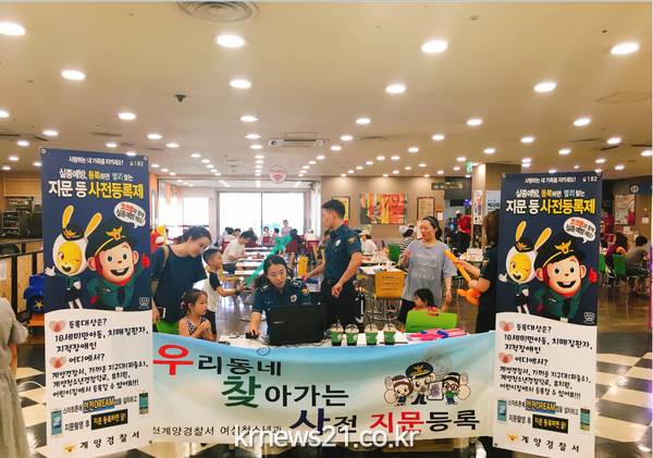 인천계양경찰서(서장 정진관)에서는 지난 5일 미아발생률이 높은 하계 휴가철 대비,미아방지 및 실종예방을 위해 홈플러스 계양점에서 ‘우, 찾,사’ (우리동네 찾아가는 사전지문등록) 실시했다."고 밝혔다.