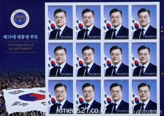 우표는 태극기를 배경으로 미소 짓고 있는 문 대통령의 모습을 담고 있고, 기념우표첩의 나만의 우표에는 학창시절 모습부터 김정숙 여사·노무현 전 대통령과 함께 찍은 모습, 5·18 기념식에서 유족을 앉아주는 모습 등의 활동사진이 들어있다.