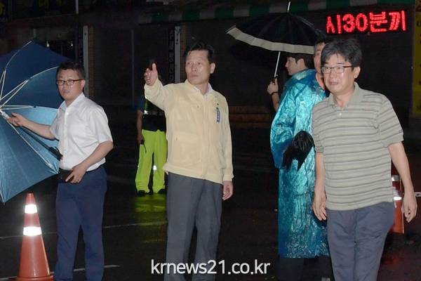 주철현 시장은 이날 을지연습 훈련으로 청 내 근무 중 도원사거리 침수 소식을 듣고 현장으로 출동해 오후 11시 도로침수 해제 때까지 현장을 직접 지휘했다.