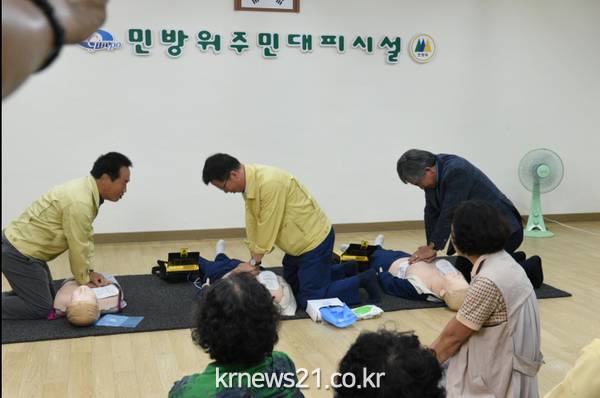 이어 대피소 내에서 심폐소생술과 방독면 착용 시연이 있었으며, 김 장관과 유 시장이 주민들 앞에서 직접 심폐소생술을 체험하기도 했다.