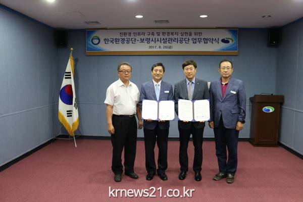 보령시시설관리공단은 지난 25일 공단 본부 회의실에서 한국환경공단 김종엽 충청권지역본부장 등 관계자가 참석한 가운데 친환경 인프라 구축과 환경복지 실현을 위 한 업무협약을 체결했다.