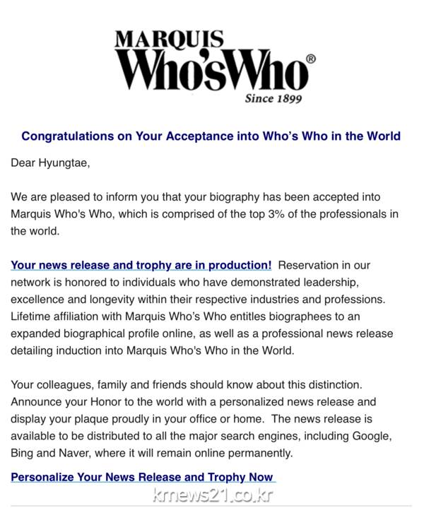 ▲ Screenshot 한편, 마르퀴즈 후즈후사(社)는 미국인명정보기관(ABI), 영국 케임브리지 국제인명센터(IBC)와 함께 세계 3대 세계인명사전을 발행하는 곳으로 1899년에 문을 열어 100년이 넘는 역사를 가지고 있어 역사적으로 가장 오래된 세계인명기관으로 세계적으로 가장 많이 알려져 있다. 이곳에서는 세계적인 인명사전인 후즈후 인더월드(Who's Who in the World)를 발간하고 있다. 후즈후 인더월드는 정치, 경제, 사회, 종교, 과학, 예술 등 각 분야에서 매년 세계적 인물 5만 여명을 선정, 프로필과 업적을 등재하고 있다.