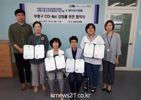부평구(구청장 홍미영) 청소년상담복지센터는 지난 1일 사회적협동조합 일터와사람들(이사장 원미정)과 ‘부평구 지역사회 청소년통합지원체계(CYS-Net) 강화를 위한 업무협약’을 맺었다."고 밝혔다.