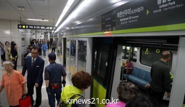2일 개통한 '서울 1호 경전철' 우이신설선 이용객 10명 가운데 4명(환승객 제외)은 무임승차객으로 드러나 수익성을 우려하는 목소리가 나오고 있다.