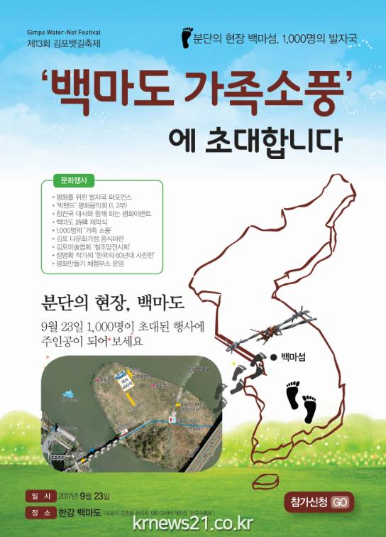 제13회 김포뱃길축제가 오는 9월 23일 시민1천여 명을 초대한 가운데 민간인통제구역인 한강 백마도에서 ‘가족소풍’으로 진행된다."고 밝혔다.