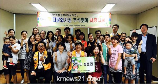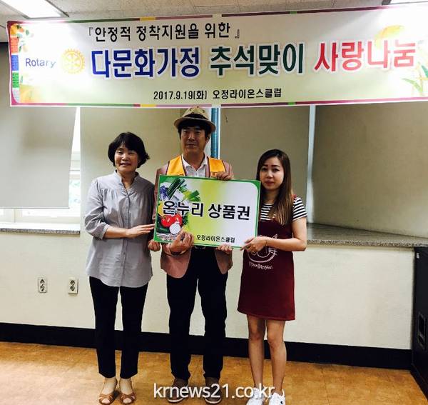 지난 19일(화) 부천오정라이온스(회장 채웅)는 부천오정경찰서의 연계를 통해 부천시노동복지회관(관장 박순희)에 결혼이주여성 추석 장보기를 위한 온누리 상품권 80만원을 후원했다."고 밝혔다.