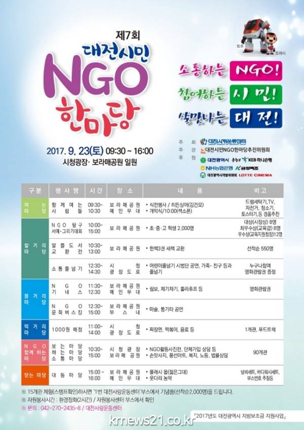 제7회 대전시민 NGO 한마당이 23일 대전시청 남문광장 일원에서 열린다.